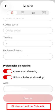 - Baja hasta encontrar “Eliminar mi perfil del Club AVIA” y haz clic.