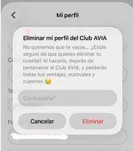 - Te recordaremos que si das de baja tu perfil de Club AVIA perderás todos los eurovales y cupones acumulados, además de las ventajas que obtienes en carburante y tienda y otras ventajas exclusivas por tener la app. Si estás decidido a eliminar tu cuenta, tienes que incluir tu contraseña y dar a “Eliminar”.