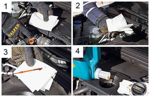 Es el elemento más importante para que el motor de tu coche funcione correctamente. Primero, localiza la varilla que marca el nivel de aceite del cárter (1). Normalmente está pintada en color amarillo, rojo o naranja. Coge un trozo de papel limpio, extrae la varilla y seca los restos de aceite (2). Vuelve a introducirla completamente y, seguidamente, sácala con cuidado. En el extremo inferior, encontrarás unas marcas; el nivel debe estar entre el mínimo y el máximo, y nunca debe superar este último: es malo para el motor (3). Si, por el contrario, está muy bajo, desenrosca el tapón de llenado de la tapa de balancines y, con cuidado, añade, poco a poco, la cantidad necesaria, con el mismo tipo de aceite que lleve tu coche (4). Después, no olvides apretar dicho tapón y colocar la varilla de nuevo en su ubicación.